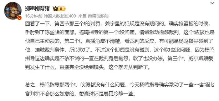 3.杨鸣第二个虽然直播角度不清楚,有可能裁判觉得杨鸣触碰了他的躯体,就算没有碰到吹也没问题,因为杨鸣一直不依不饶继续喷裁判;