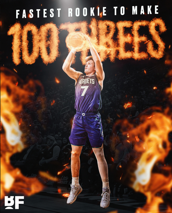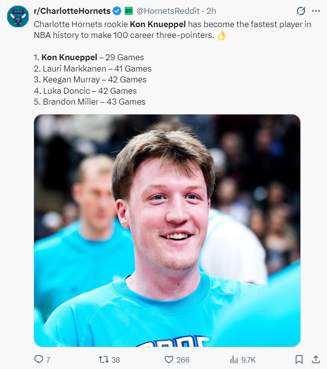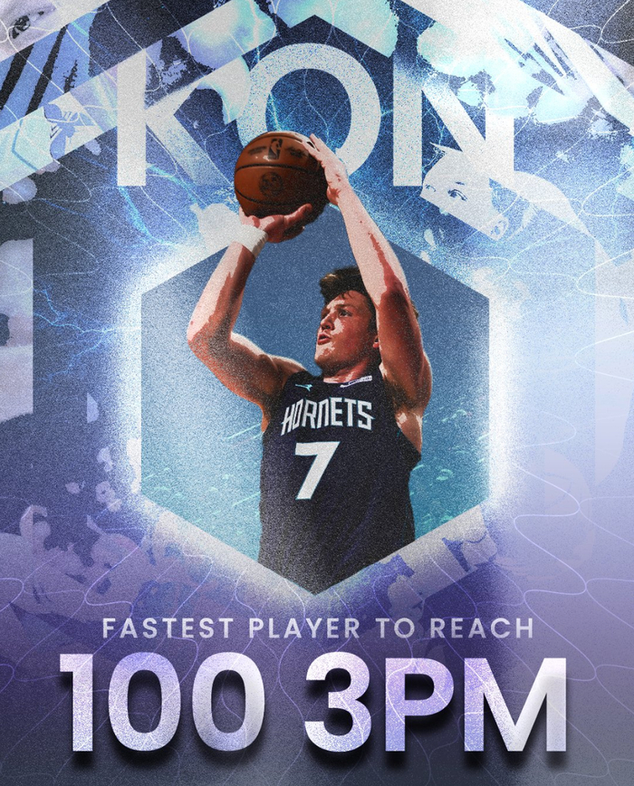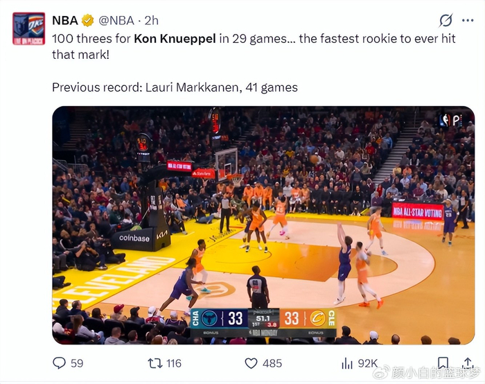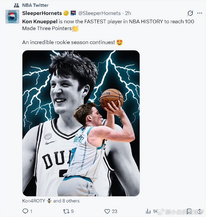 黄蜂官方也晒出克努佩尔历史最快100+三分的海报为这位20岁,身高1.98米的白人投手点赞,大家注意一下克努佩尔是纯白人投手,他的偶像是克莱而非库里。