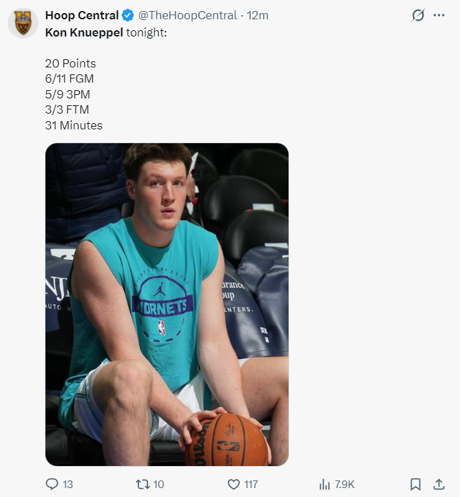 在首节即将结束前克努佩尔命中三分球就打成了生涯第100记三分里程碑,此役他命中5个三分球,他的生涯三分球已经提升到104个。