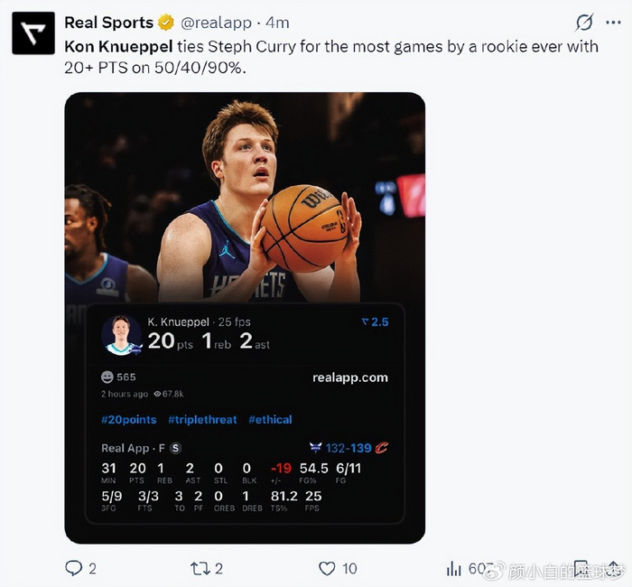 这场比赛克努佩尔拿到20+命中率50%+三分命中率40%+罚球命中率90%,他比肩库里成为历史第二位单场达成这样数据的新秀。
