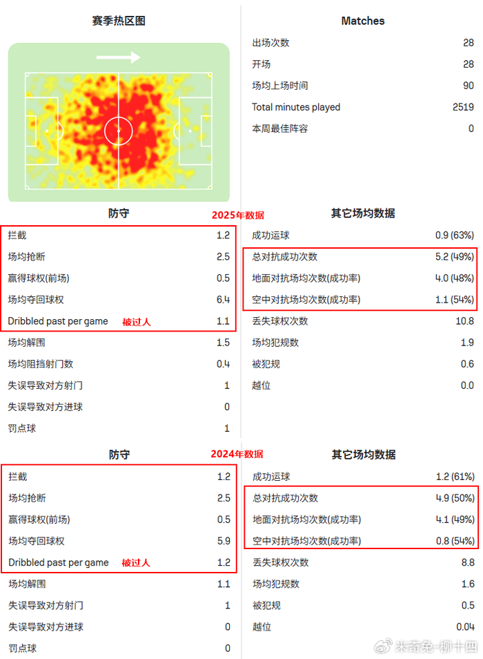 当然茹萨在上海海港的基本盘还是防守,过去2个赛季他的防守数据是较为稳定的。在奥斯卡离开后,2025赛季的茹萨在防守端的抢断和拦截数据和2024赛季完全相同,场均夺回球权略有增加。